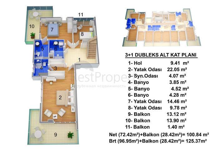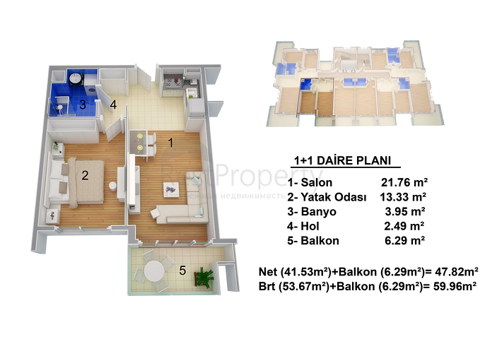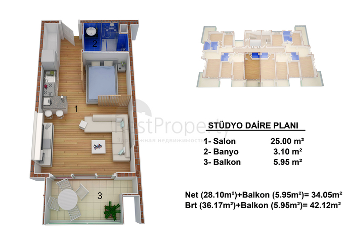 شقة بغرفة نوم واحدة 1+1 مع أثاث وشرفة في منطقة محمودلار